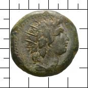 Kopf des Dionysos nach r. mit Gewandansatz, er trägt Efeukranz und Strahlenkrone.