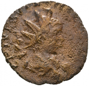 Vorderseite: C PIV ESV TETRICVS CAES. Büste des Tetricus II. nach r., mit Strahlenkrone, in Gewand, vom Rücken gesehen.