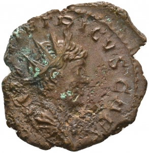 Obverse: C PIV ESV TETRICVS CAES. Büste des Tetricus II. nach r., mit Strahlenkrone, in Gewand, vom Rücken gesehen.