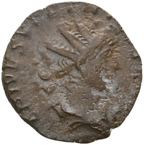 Vorderseite: C PIV ESV TETRICVS CAES. Büste des Tetricus II. nach r., mit Strahlenkrone, in Gewand, vom Rücken gesehen.